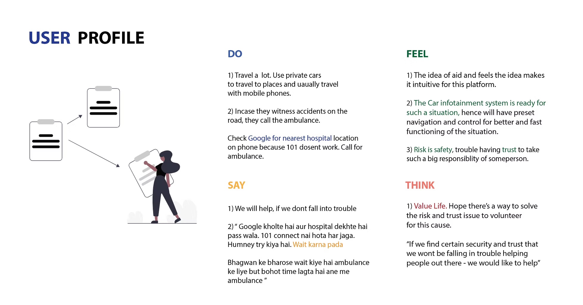 To keep it real and understand how things work in the field, we interviewed, observed 30 drivers, and documented our learnings from the users and surroundings which impact the users in day to day lives. Some of the questions we noted were the patterns of daily life, of the drivers life, addressing questions like - in India, how many of us know the emergency number to call an ambulance or a help aid for help? Do you know a number to the nearest place for seeking help aid in a different city or a place you have never visited? What would you do?